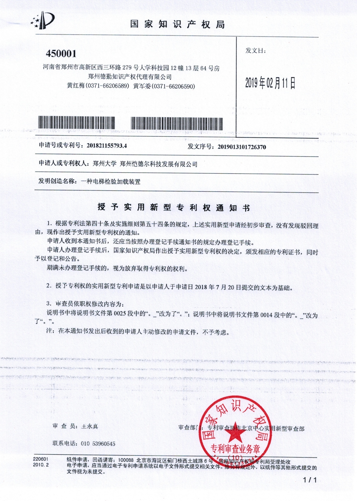 近日,由鄭州愷德爾科技發展有限公司撰寫申請的“一種電梯檢驗加載裝置”獲得國家專利局授權!