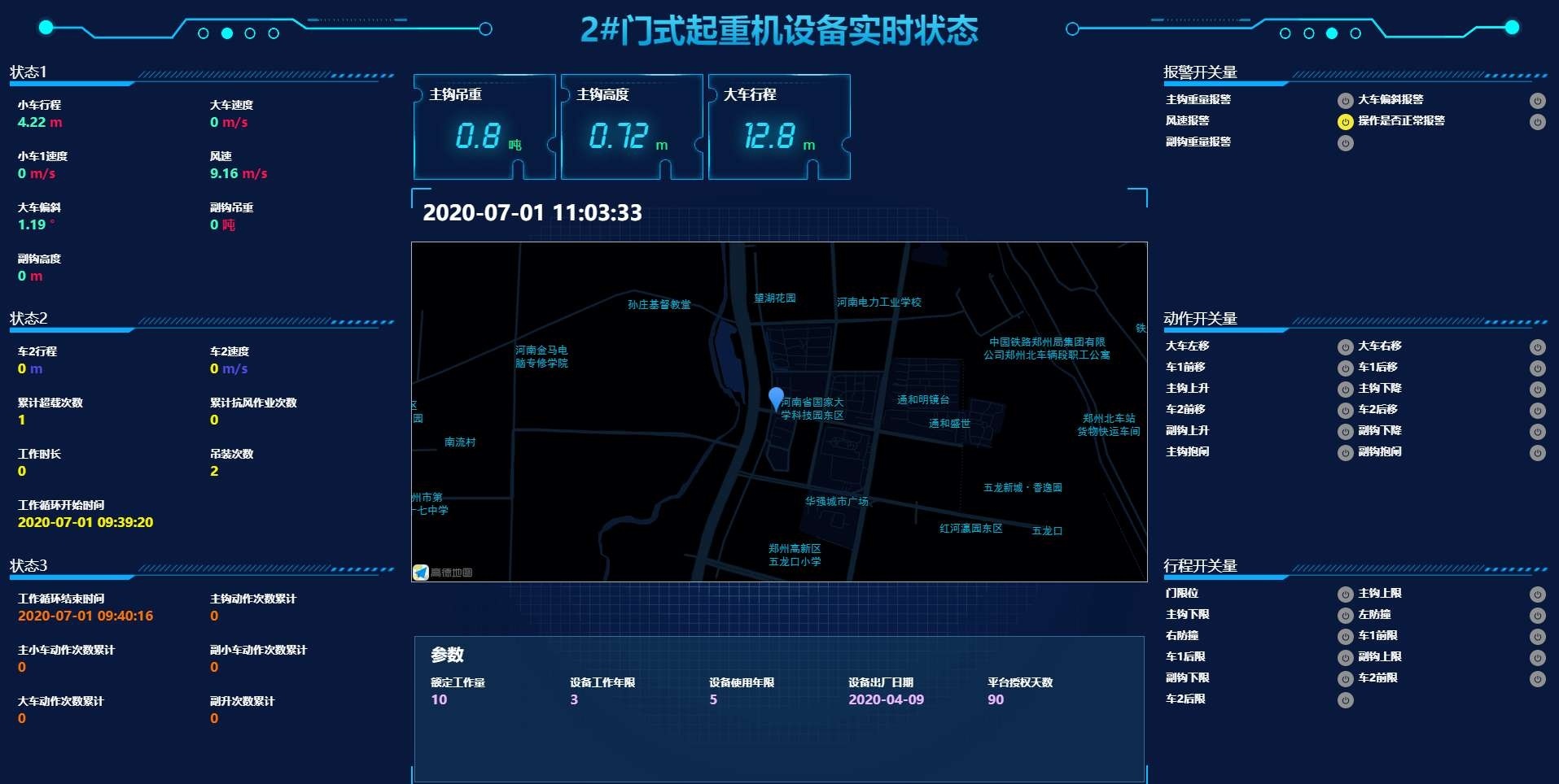鄭州愷德?tīng)柨萍冀璐舜未髸?huì),推出自己的起重機(jī)安全監(jiān)控系統(tǒng)及后臺(tái)管理系統(tǒng),后臺(tái)管理系統(tǒng)可以實(shí)時(shí)顯示起重機(jī)的工作狀態(tài),根據(jù)檢測(cè)到的各種數(shù)據(jù),計(jì)算出累計(jì)起重量,有效工作時(shí)間,輔助工作時(shí)間,設(shè)備功效等,實(shí)現(xiàn)了施工管理人員對(duì)設(shè)備的實(shí)時(shí)監(jiān)測(cè),出現(xiàn)故障或者違章操作時(shí),系統(tǒng)自動(dòng)報(bào)警并記錄存儲(chǔ)該信息,以便工作人員事后查詢(xún)及追責(zé)。